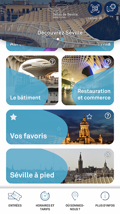 Vivez Séville et vivez-la à votre rythme avec la nouvelle application gratuite de Setas de Sevilla. Nos contenus sont conçus sur mesure pour vous permettre de découvrir, un à un, tous les secrets de la ville. Parcourez les passerelles de notre mirador avec les indications de l'application et accédez aux contenus exclusifs que nous vous proposons. Avez-vous déjà vu le Giraldillo de près ? Avec notre application, vous pourrez le voir sur votre écran ! Avec une multitude de ressources de texte, photos, vidéos, pièces tridimensionnelles, réalité virtuelle et guides audio. L'application de Setas de Sevilla met la grandeur de la ville entre vos mains. De plus, si vous marquez vos endroits préférés à visiter pendant votre parcours dans nos passerelles, vous pourrez accéder à ces informations plus tard et l’application vous accompagnera depuis les Setas de Sevilla à n'importe quel point de votre visite.